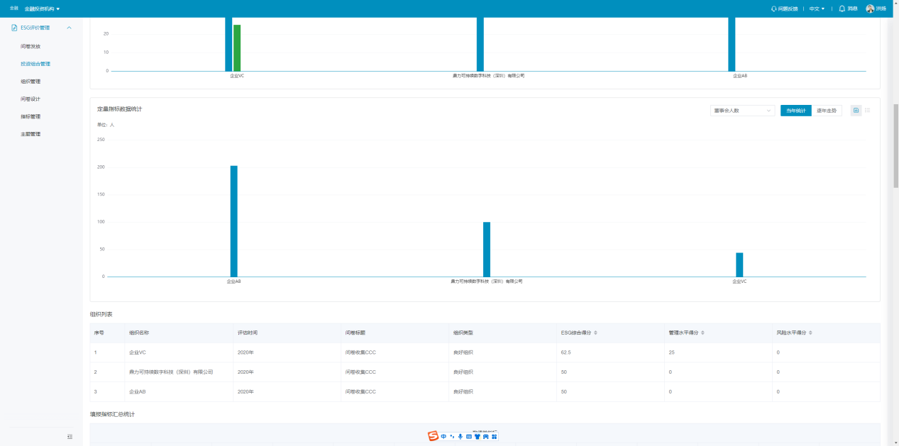 - 组织得分情况统计:以柱状图形式展示各企业的ESG综合得分、管理水平得分和风险水平得分情况。