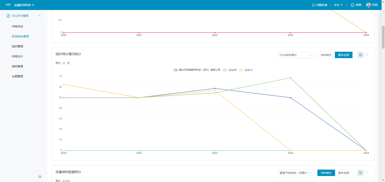 点击投资组合列表上的组合名称或操作栏里的“评估记录”按钮进入详情页;组织详情页内可查看各企业的当前填报数据对比以及历年数据走势;同时也可切换年度,看每年的定量数据。