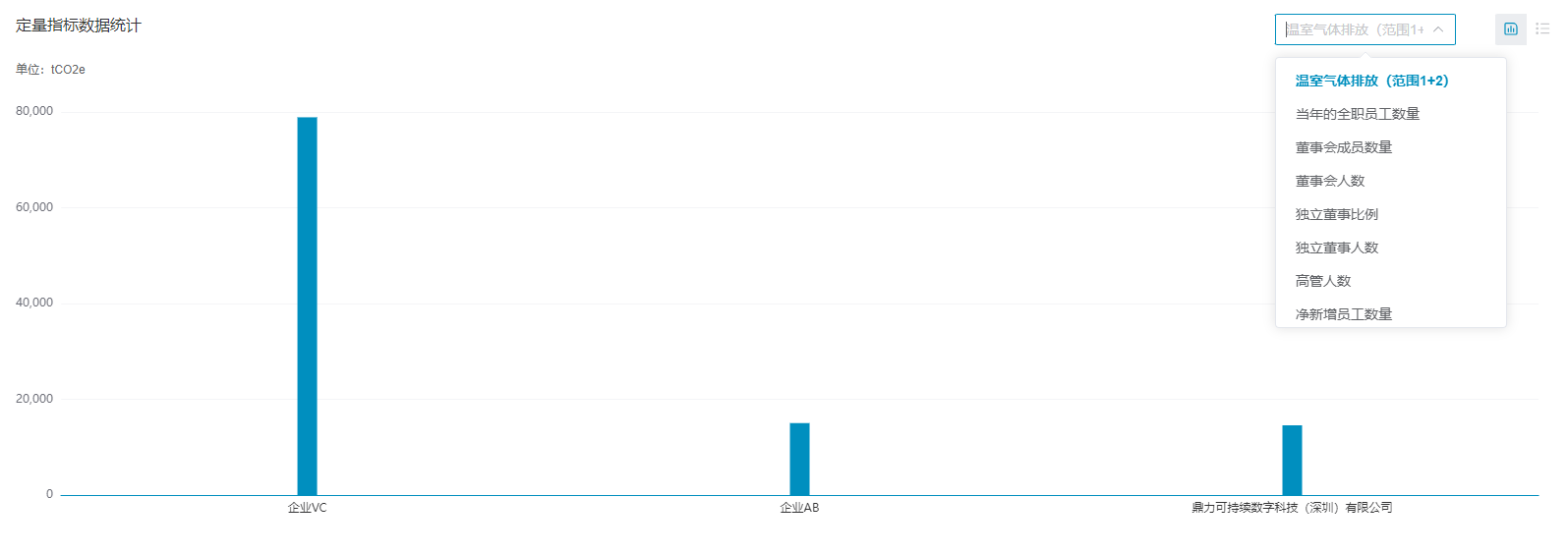 - 定量指标数据统计:以柱状图形式展示各企业在各定量指标的填报情况。支持定量数据图表切换,查看不同指标各企业的数据对比情况。