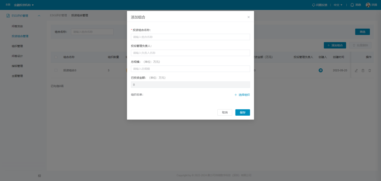 点击“添加组合”后,在弹窗内完善投资组合信息,包括组合基本信息和包含的企业名单;组合基本信息包括投资组合名称、投后管理负责人、总规模和已投资金额,其中已投资金额为系统自动计算,将根据各企业的投资金额进行自动汇总并显示;组织名单需添加现有企业至当前投资组合内。