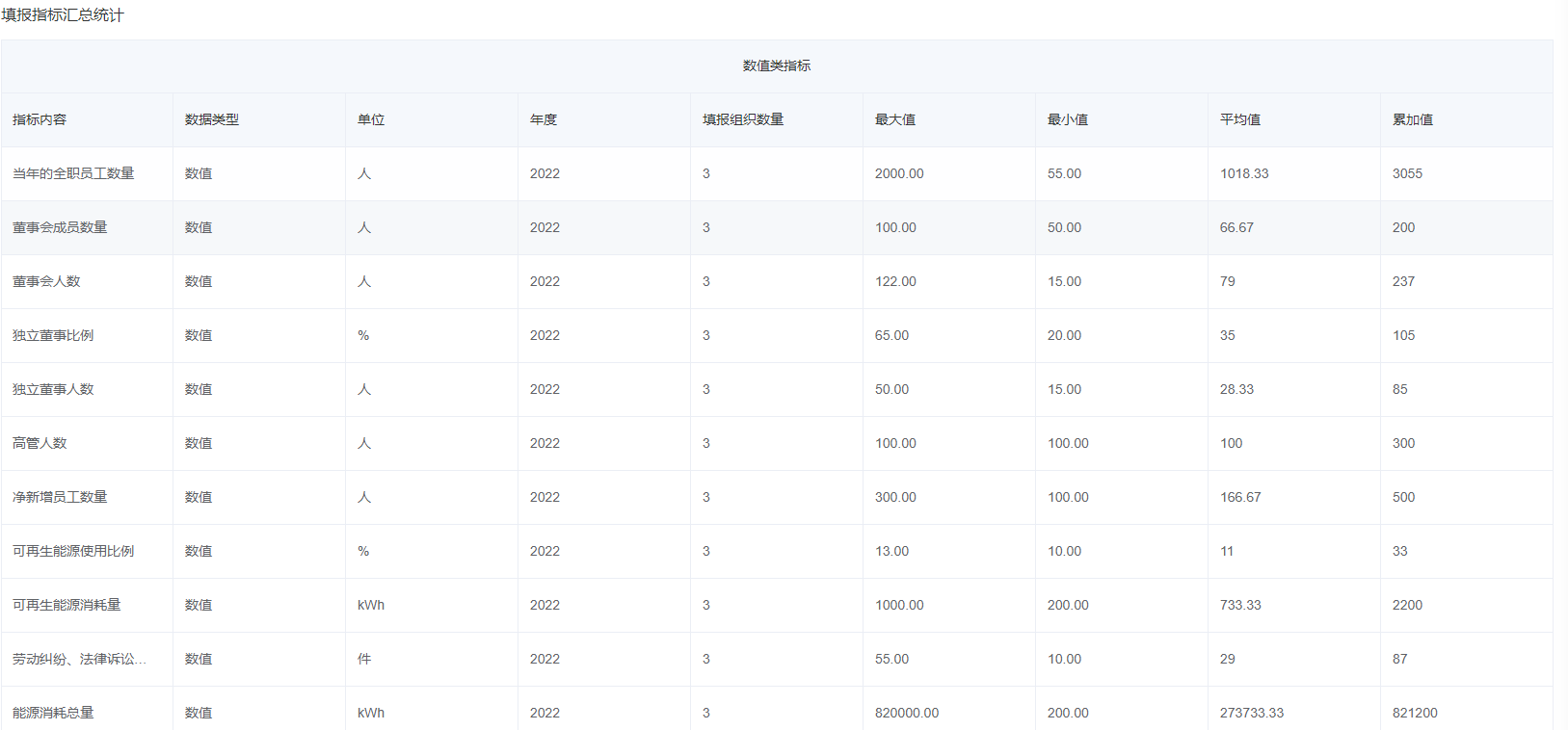 - 填报指标汇总统计:按指标类型进行各指标的填报数据汇总统计;数值类指标支持最大值、最小值、平均值和累加值统计;选项类指标支持各选项填报占比统计;文本类指标支持平均字数统计。