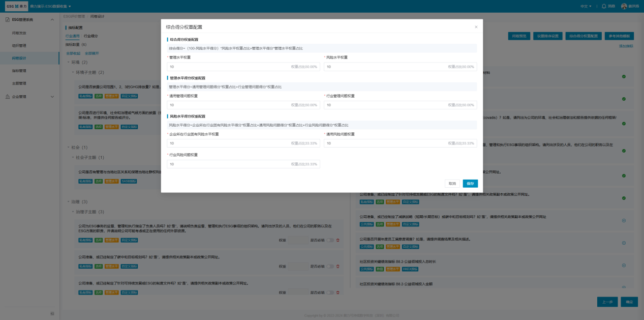 选择模板后,可在问卷上单独设置得分公式中的各权重值;系统会将问卷中已设置好的数值同步过来,用户可选择重新调整;调整后的权重值仅在此问卷中生效,将不影响模板中的配置;