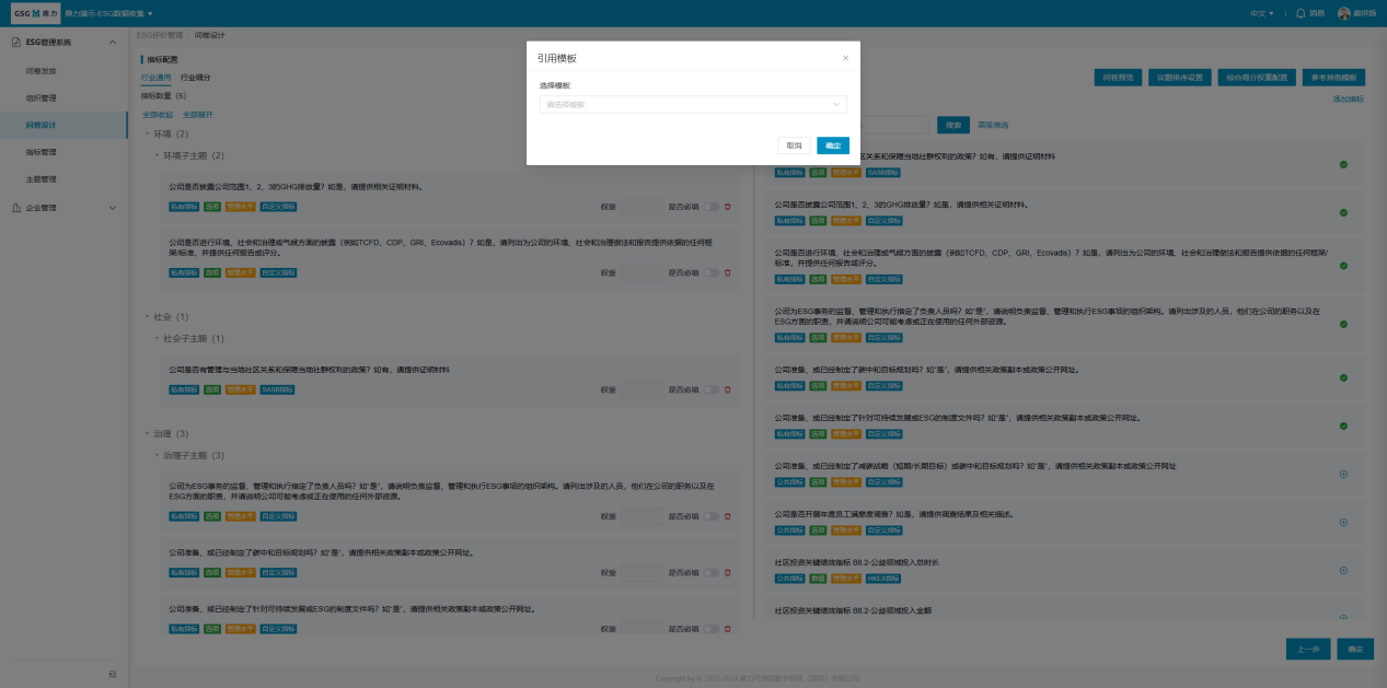 问卷设计模块用于维护问卷指标模板。企业事先在此创建好适用于不同投资组合、不同使用场景、不同时间节点的问卷模板后,在创建问卷时,选择对应的模板便等同于配置问卷填报指标,这样便可以节省每次创建问卷时配置指标所用的时间。