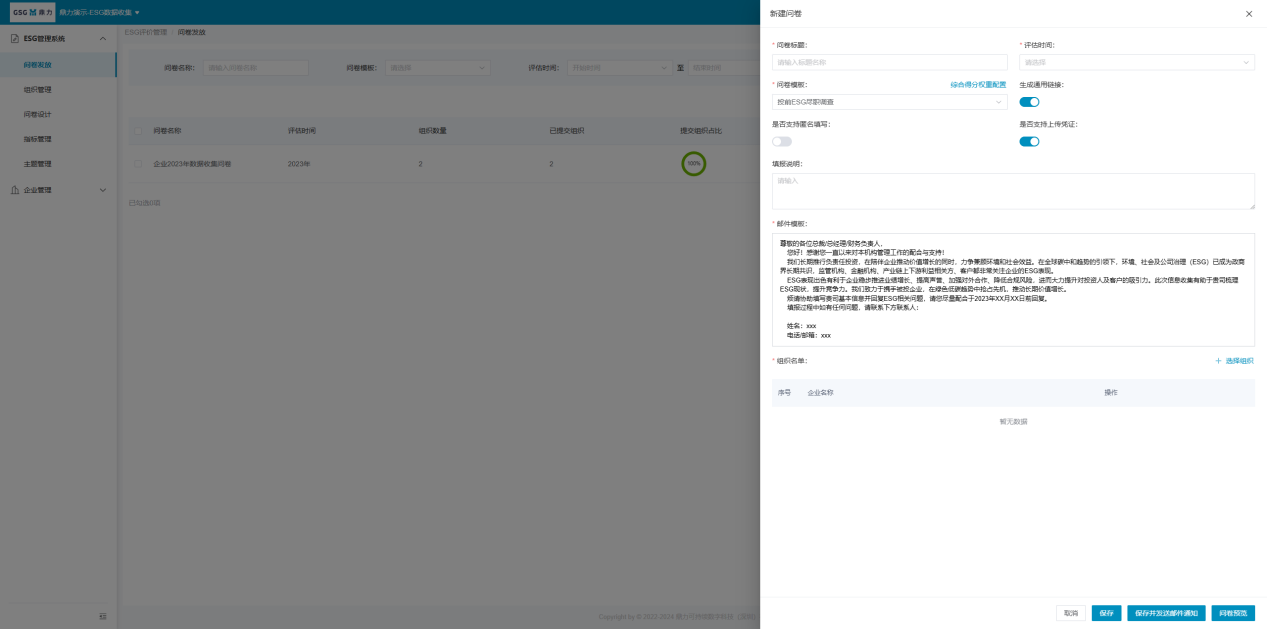 点击“新建问卷”后,在弹窗内完善问卷基础信息,包括问卷标题、评估时间、问卷模板、生成通用链接、匿名填写、上传凭证、填报说明、邮件模板配置、组织名单;问卷模板需要事先在“问卷设计”模块内维护好,每个模板内配置好填报指标,则新建问卷时,选择对应的模板后,即可将模板内的指标设置为本次问卷的填报指标;