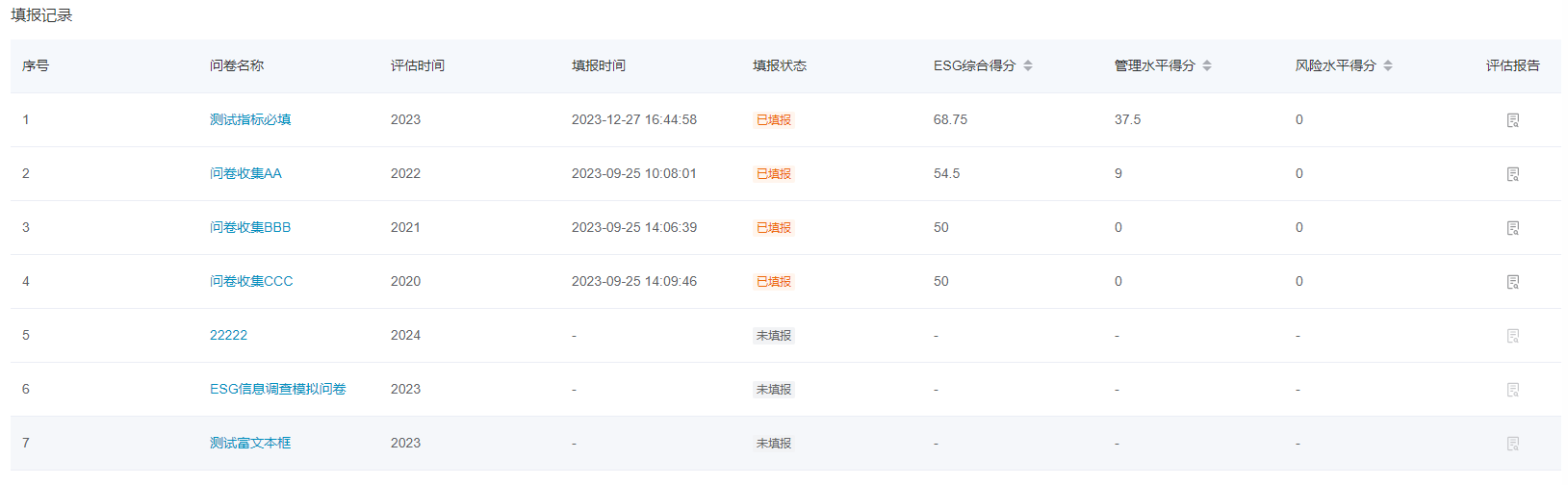 填报记录 企业已填报的问卷信息记录,并可查看每份问卷的评估报告;同时,点击问卷名称可进入填报页查看企业的填报详情。
