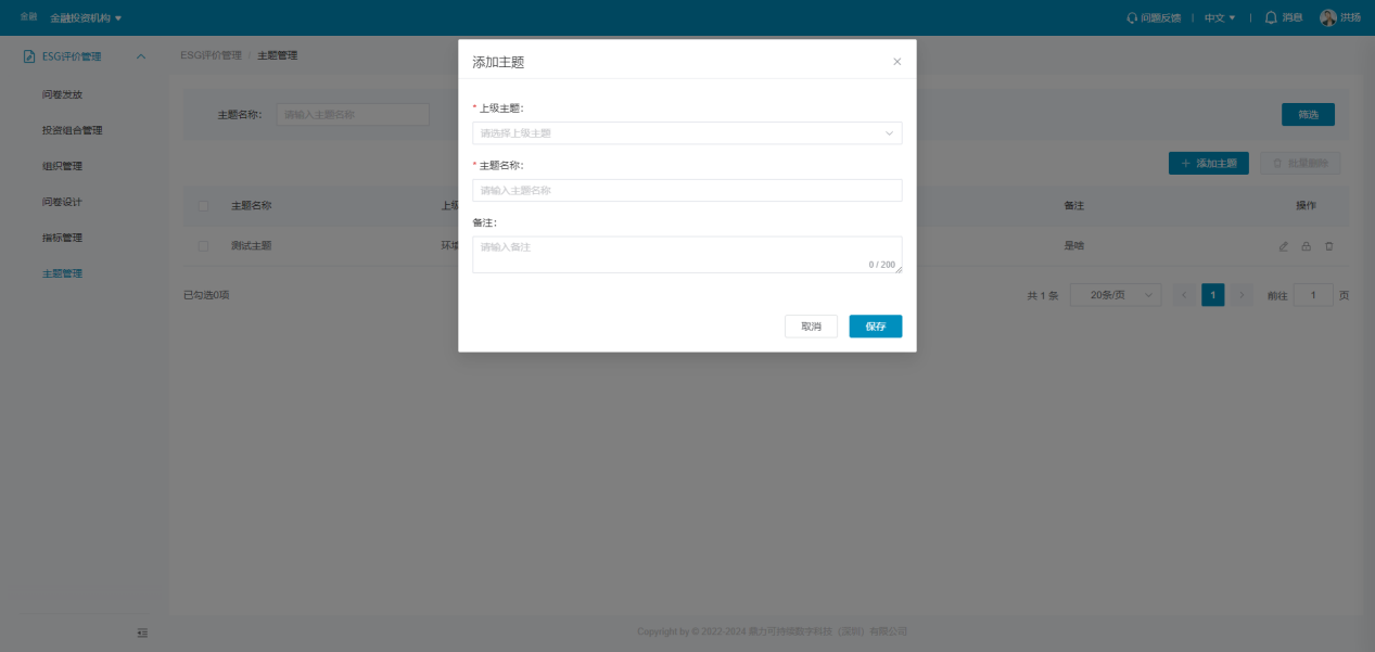 主题作为指标的一个属性,目前支持用户自定义维护二级主题及其下级主题,一级主题是固定的,包括社会、环境、治理、基金管理人ESG调研问题和其他。用户在为指标选择主题时,仅支持选择非一级主题。