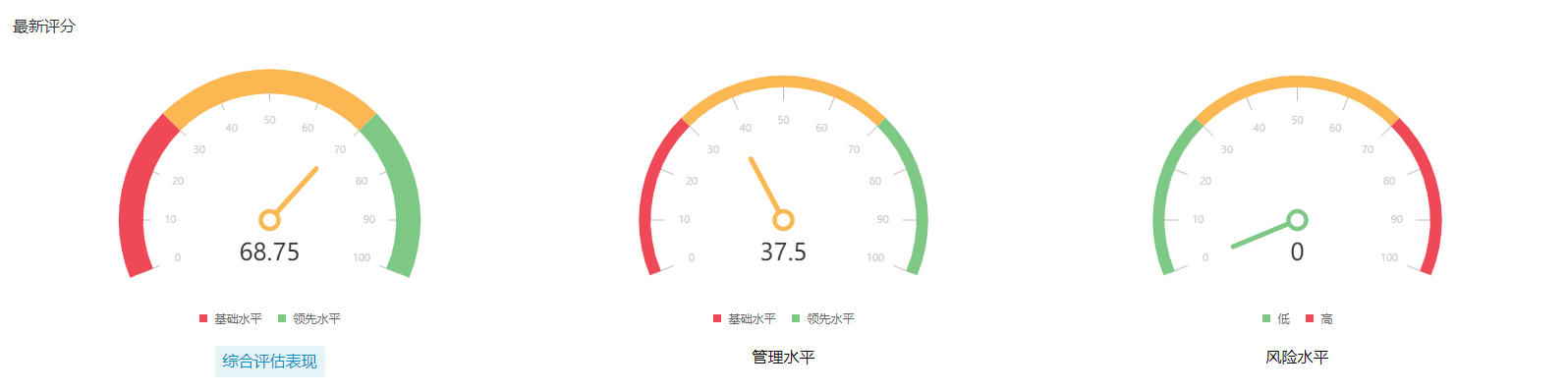 最新评分 以仪表图形式展示企业最新的得分情况,包括综合得分、管理水平得分、风险水平得分。
