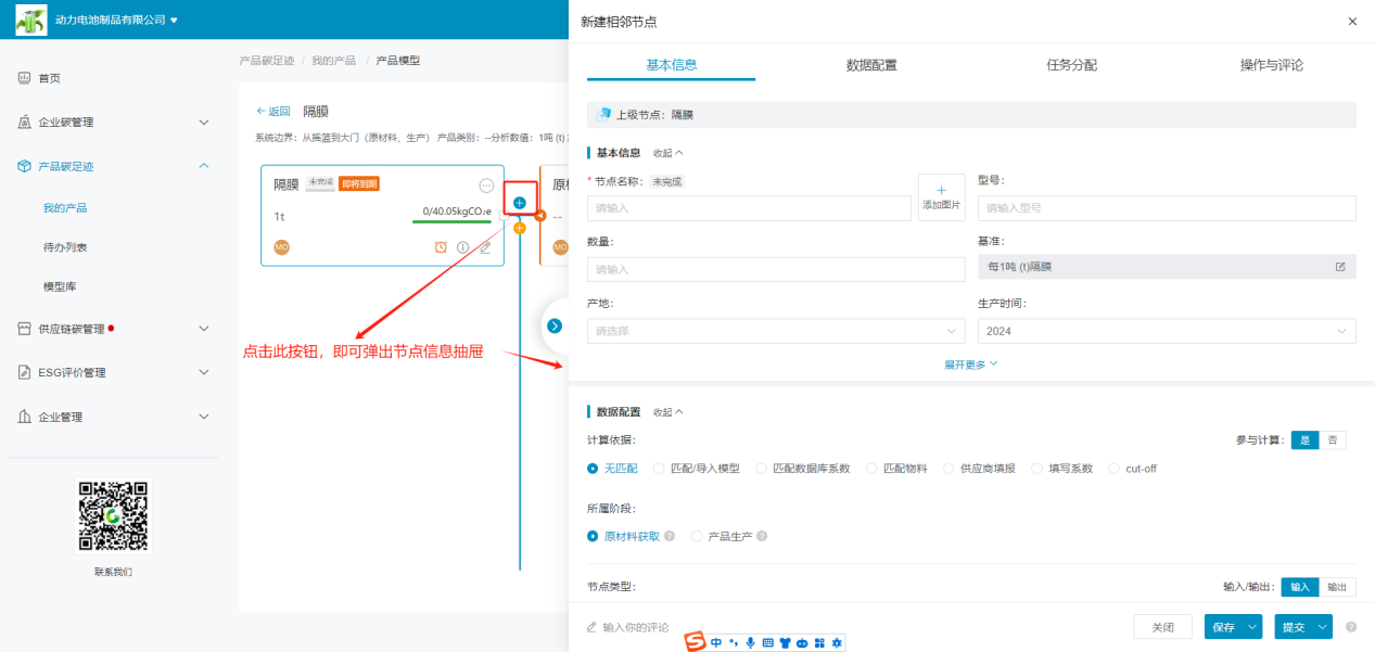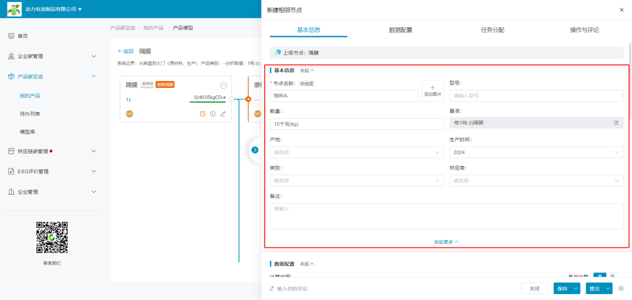 - 基本信息:包括节点名称、型号、数量、基准、生产时间等信息;如当前节点为一种物料A,则节点名称输入物料A的名称即可;数量的填写需参考基准,基准默认参考当前产品的数量,如当前产品为“1吨隔膜”,当前节点为物料A,则生产1吨隔膜需要用到物料A的数量,即为当前节点的数量;