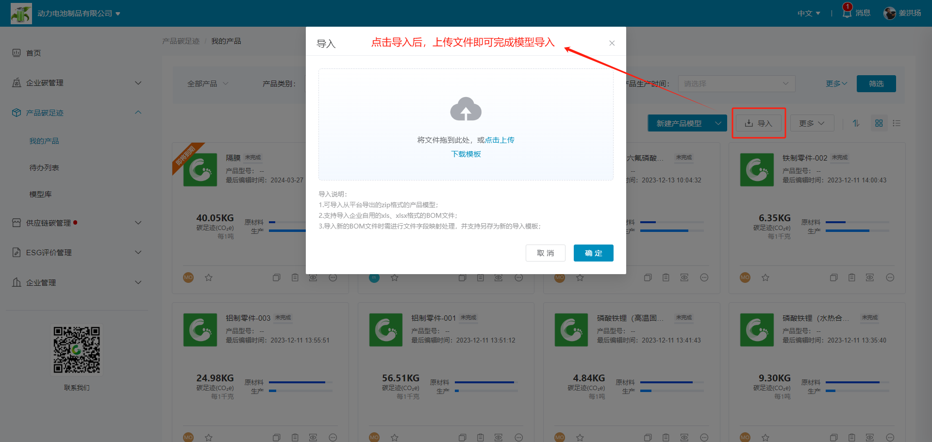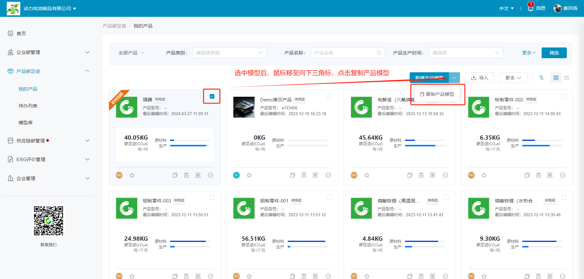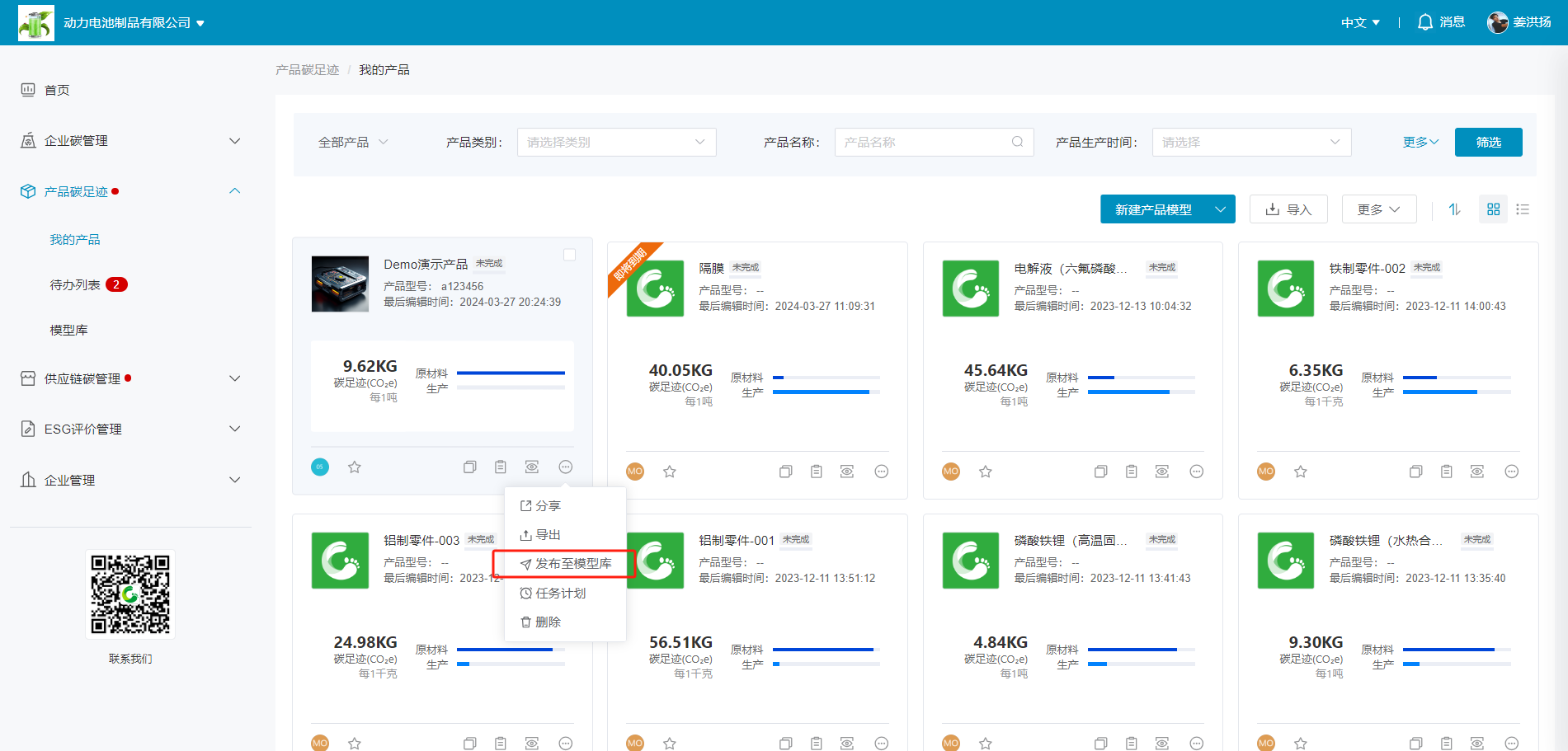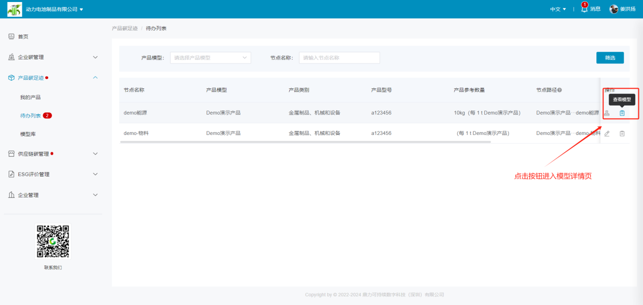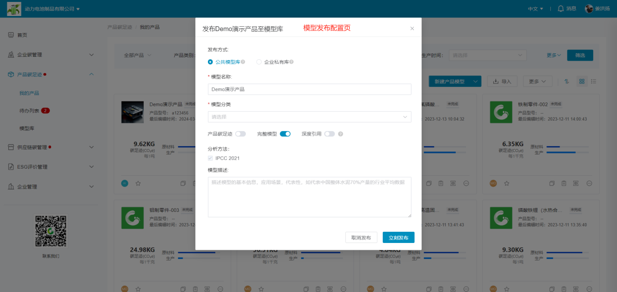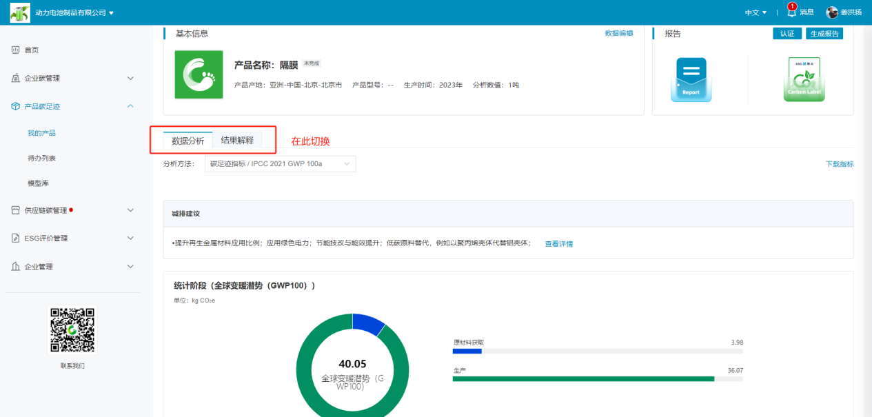 - 产品碳足迹:仅支持查看产品模型的碳排放情况;