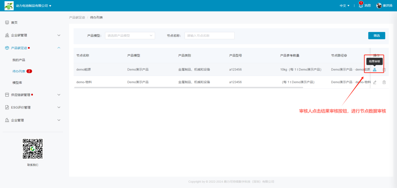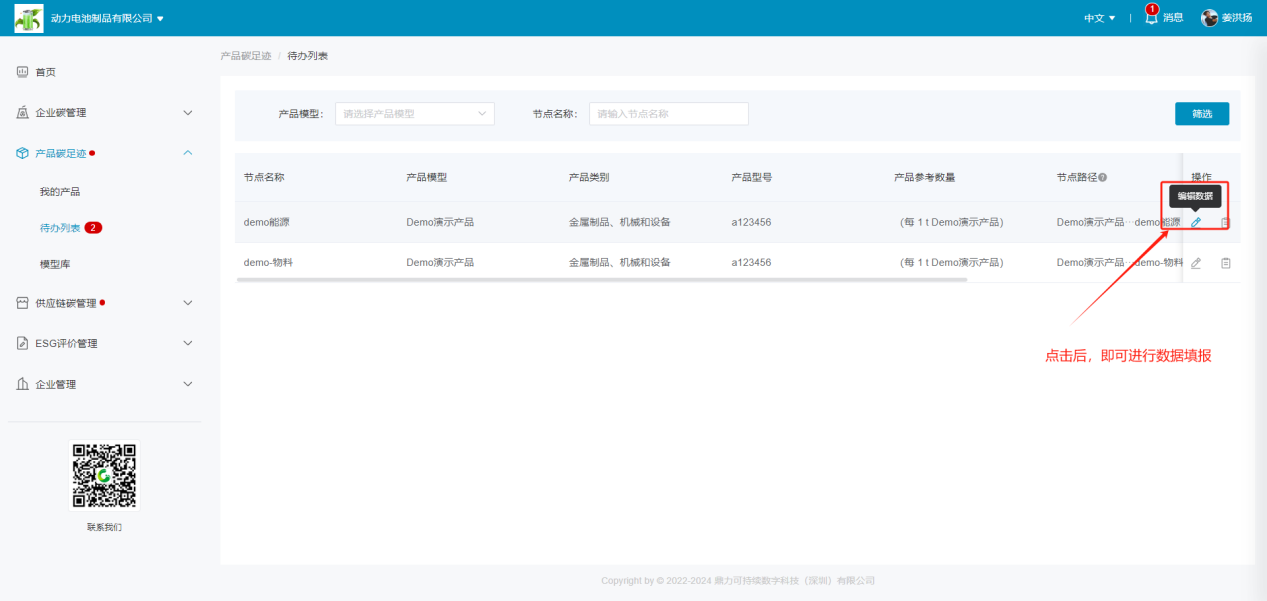 - 任务分配:可将节点的数据填报、数据审核工作指派给相关人员进行跟进;可选人员范围为已在系统内加入企业的用户;被指派的用户,会在左侧的“待办列表”里接收到待办任务;